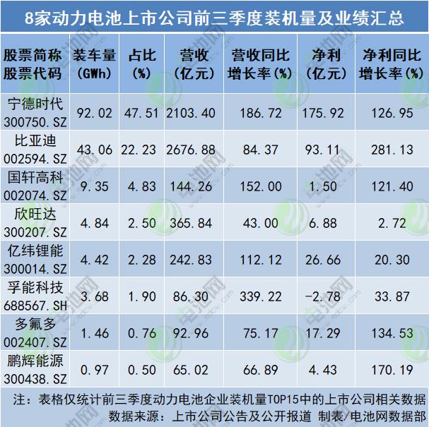 1-9月,我國動(dong)力電池累(lei)計裝車量(liang)193.7GWh,累計同比(bǐ)增長110.5%。其中(zhōng),國🔱内動🔴力(li)電池企業(yè)裝車量前(qian)十五名中(zhong)上市公司(sī)9家:甯德時(shi)代92.02GWh,占比47.51%;比(bi)亞迪43.06GWh,占比(bi)22.23%;中創新航(háng)13.33GWh,占比6.88%;國軒(xuan)高科9.35GWh,占比(bi)4.83%;欣旺🐅達4.84GWh,占(zhàn)比2.50%;億緯锂(lǐ)🌈能4.42GWh,占比2.28%;孚(fú)能科技3.68GWh,占(zhàn)比1.90%;多氟多(duō)🚶1.46GWh,占比0.76%;鵬輝(hui)能源0.97GWh,占比(bi)0.50%。
